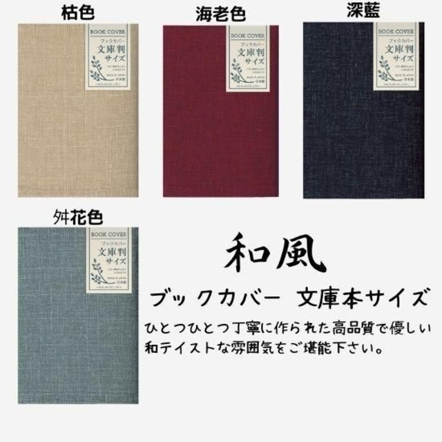 カラーは枯色、海老色、舛花色、深藍の4色展開! 国内生産にこだわり丁寧に作られたブックカバー。使う人が納得できるおすすめのクオリティです 〇安心の日本製。生地の選定から刺繍・縫製~パッケージ入れまでの全作業が日本国内で行われているメイドインジャパン商品です ひとつひとつ丁寧に作られた高品質で優しい和テイストな雰囲気をご堪能いただけます。 ・標準的な文庫本サイズに対応 ・裏地、表地とも優しい肌触りのコットンを使用 ・リボン素材のしおり付き ・素材の優しい感じをそのまま使用 ■サイズ:タテ16cm×ヨコ30cm(文庫サイズ)・パッケージサイズ:タテ17.3cm×ヨコ24.5cm×厚み0.4cm ■カラー:枯色、海老色、舛花色、深藍 ■素材:コットン他 **こちらはお取り寄せ商品となります(7~10営業日の出荷)** お取り寄せ商品はお客様のご入金確認後、メーカー様へ発注いたします。 当店へ到着後、検品・梱包して、お客様へ発送となります。 お客様にはお時間を頂くことになり誠に申し訳ございませんが、ご了承いただきますようお願い申し上げます。