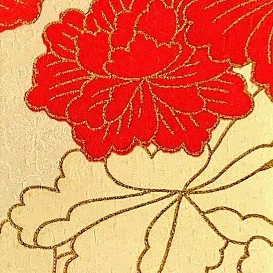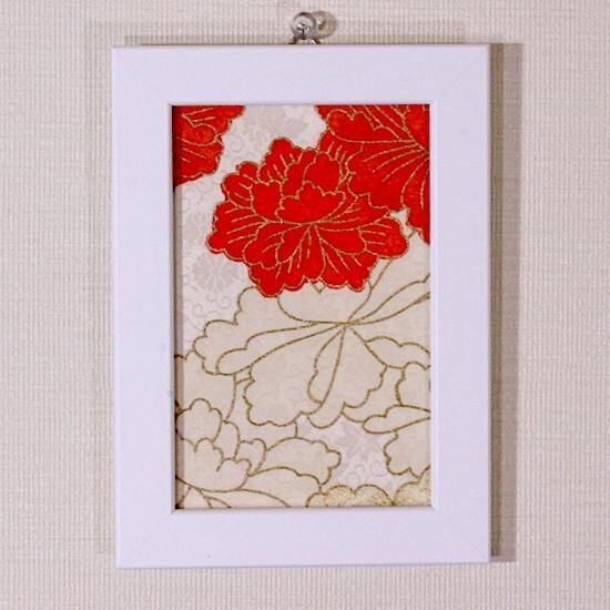 アンティークの色留袖のハギレで、ポストカードサイズのファブリックプレートを作りました。大柄ですが、綸子で細かい文様が織込まれています。綸子は光の具合で模様が浮き出る上品な正絹です。